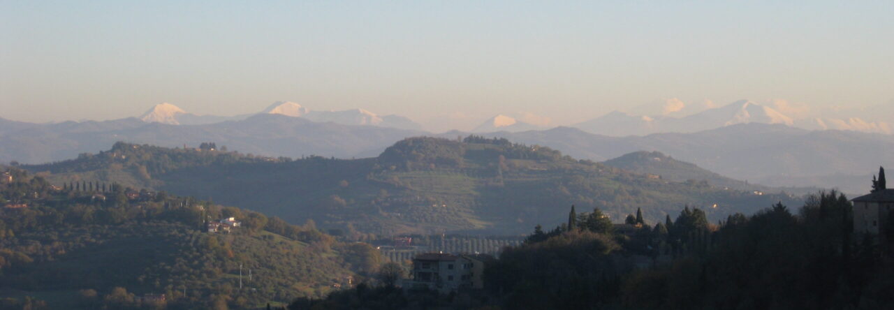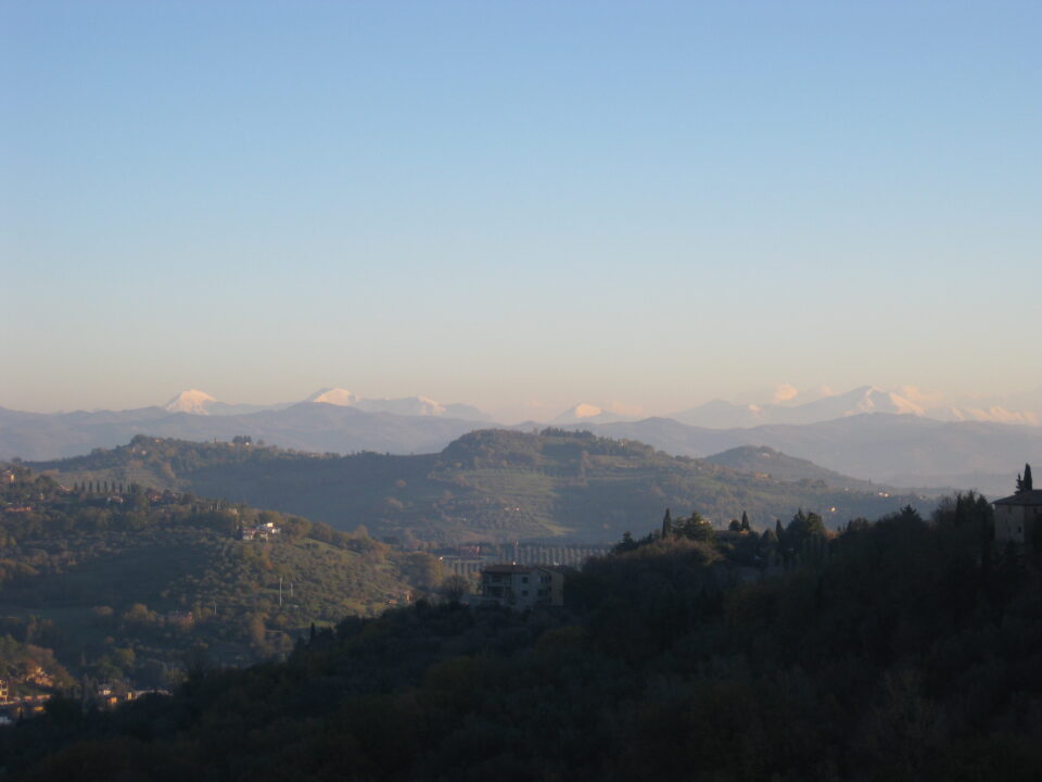 In primo piano, le ondulazioni del Colle di Perugia, degradanti verso la Valle del Tevere (non visibile nella foto).